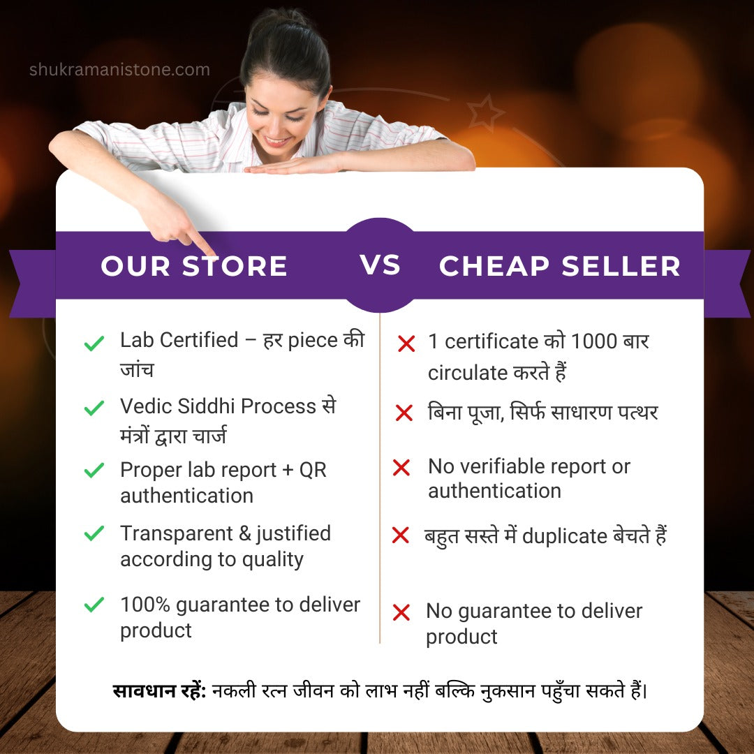 Every stone we provide goes through proper testing and verification. We make sure you receive a Shukramani that is natural, clean, and ready to wear. Along with the stone, you also get clear guidance on how to wear it, how to purify it, and what to expect—something many sellers ignore.