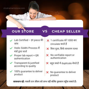 हमारे द्वारा प्रदान किया गया Shukra Mani natural और untreated stone होता है। प्रत्येक piece को carefully selected और checked किया जाता है ताकि ग्राहक को एक authentic और genuine product प्राप्त हो। हम artificial या lab-made stones का उपयोग नहीं करते।